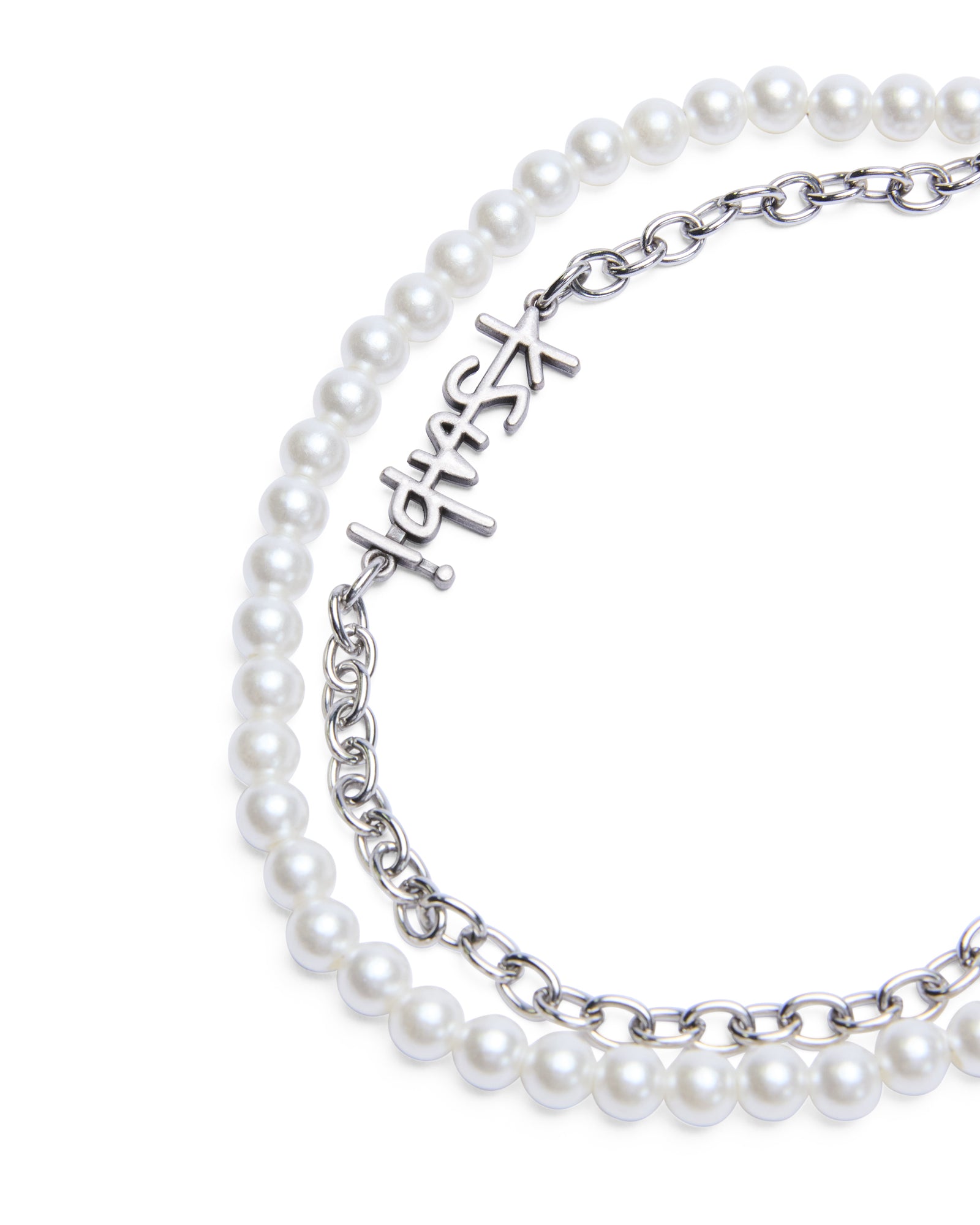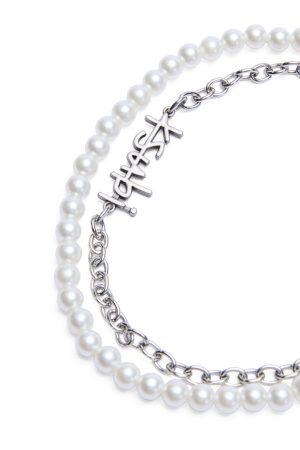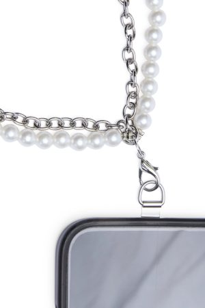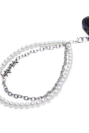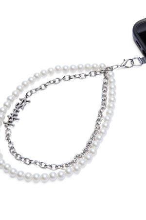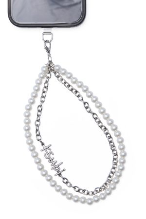 The 1999 Chains Phone Wrist Strap features a luxe faux pearl strand paired with a stainless steel chain and finished with a polished stainless steel Ksubi logo charm. Designed to attach to most phone cases. it offers a functional yet elevated way to carry and style your device.