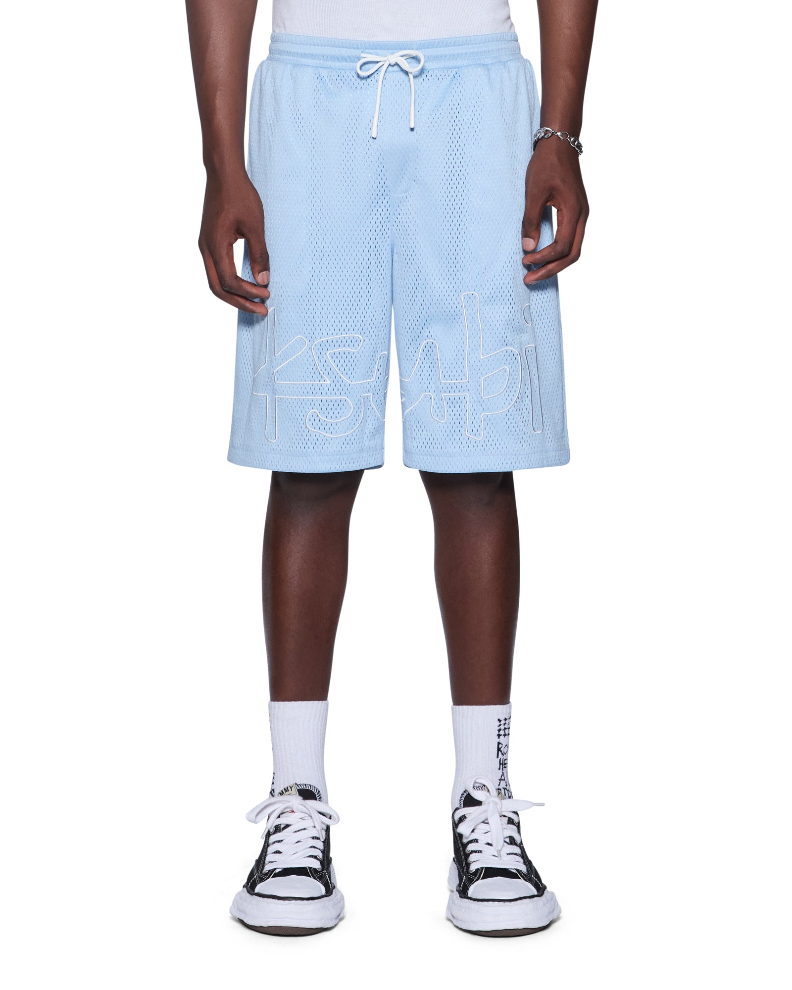 The 1999 Mesh Roll Short Sky Blue is a basketball-inspired style crafted from premium sky blue mesh fabric with a relaxed long wide leg silhouette and an elastic waistband for comfort. The design features 1999 artwork printed across the front. side and rear welt pockets. and signature embroidered Ksubi branding for a street-ready finish.