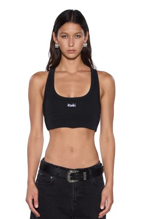 The 1999 Origin Crop Tank Black is a scoop neck fitted tank top in a white colorway. featuring a racerback design and cropped length. Made from premium midweight rib fabric with a smooth. dry hand feel. it includes an internal shelf bra for added support and a raw cut hem. finished with T-box embroidery and a front Ksubi logo graphic.