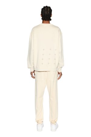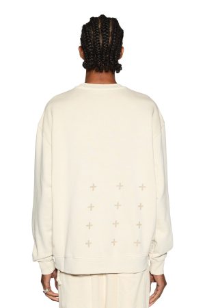 The Kross Biggie Crew Desert is an oversized fit crew neck sweat in a cream colourway. Garment dyed and made with a premium cotton loopback fleece with aged wash. This style features original Ksubi oversized back 4×4 cross print. front cross dollar embroidery. signature rats tail and Ksubi t-box printed branding.