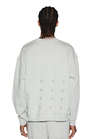 The 4 X 4 Biggie Crew Grey Marle is an oversized crew neck sweater featured in a grey colourway. Constructed from a premium cotton loopback fleece. the crew is garment dyed and finished with an aged wash. This style features the original Ksubi oversized back 4×4 cross print. front cross dollar embroidery. signature rats tail and Ksubi t-box printed branding.