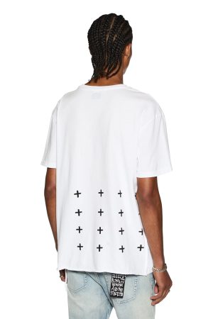The 4 X 4 Biggie Short Sleeve T-Shirt Optic White is an oversized fit featured in a white colourway. Constructed from a premium cotton open ended jersey. the tee is garment dyed and finished with an aged wash. This style features the original Ksubi oversized back 4×4 cross print. raw back hem detail. front cross dollar embroidery. reverse overlocked side seams. signature rats tail and Ksubi t-box printed branding.
