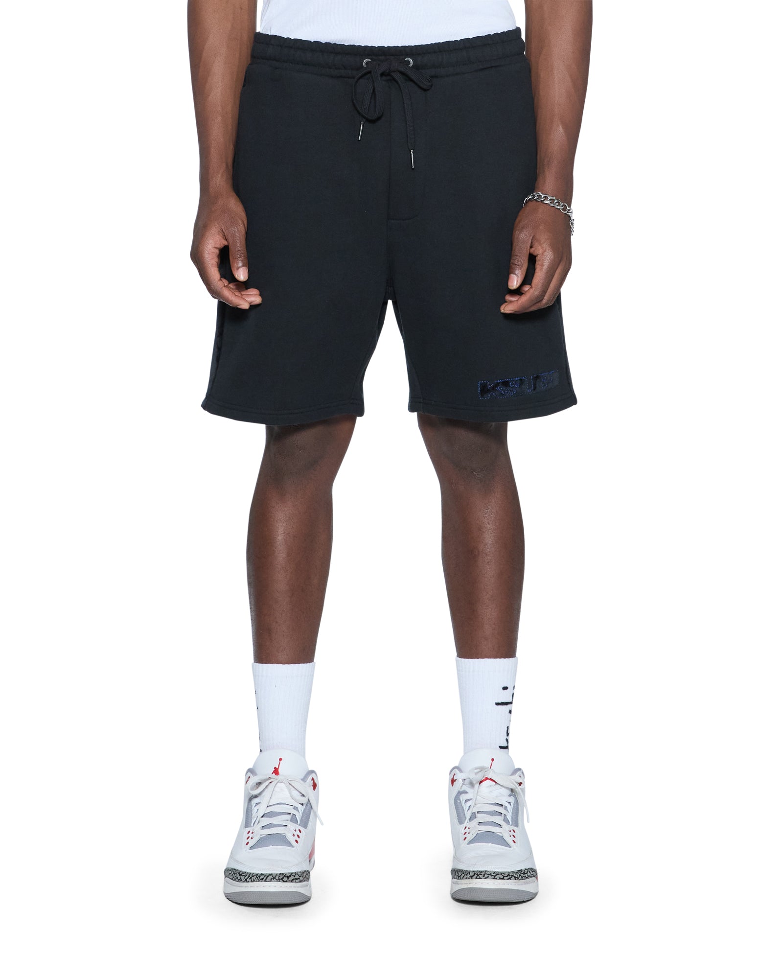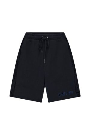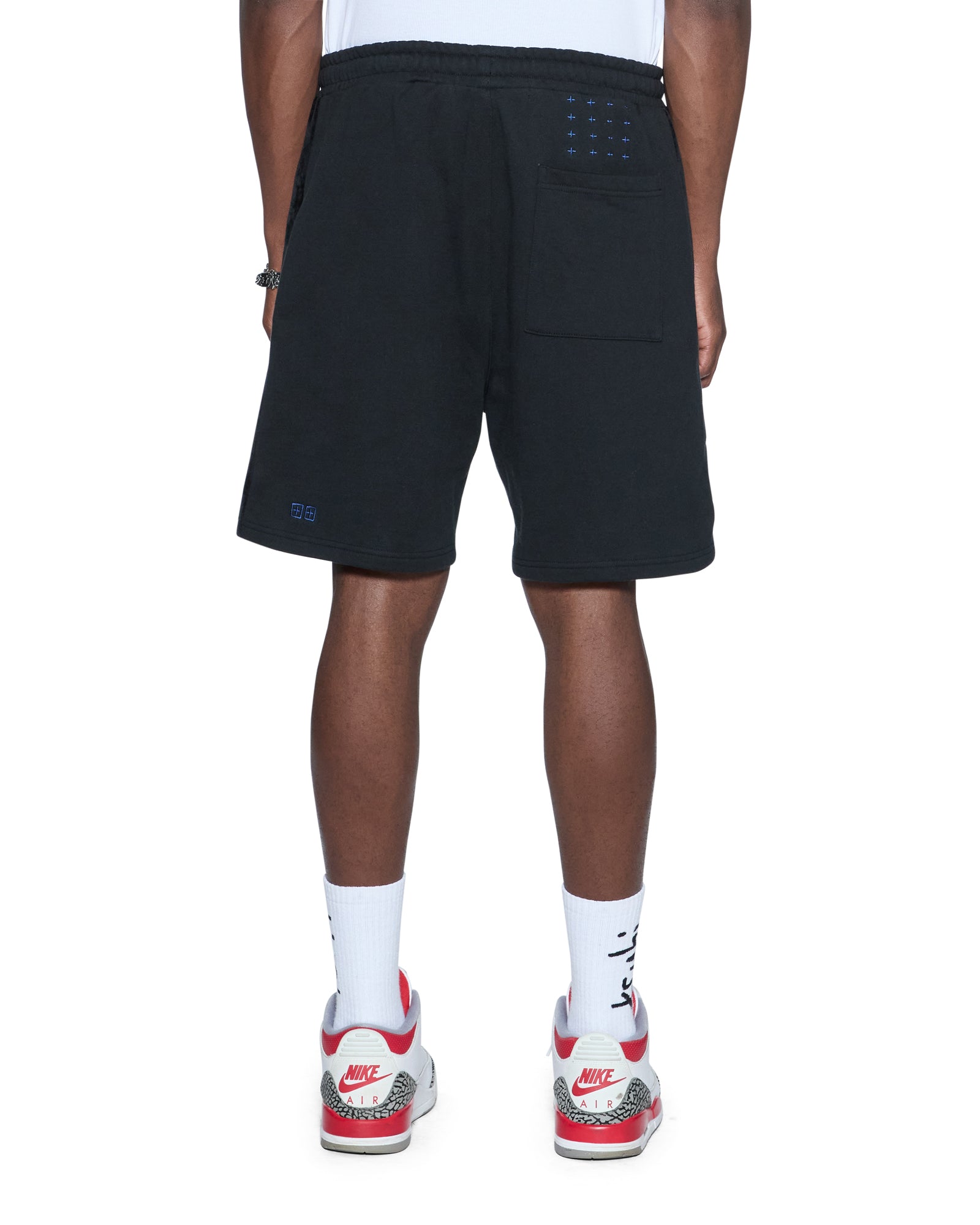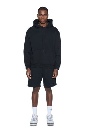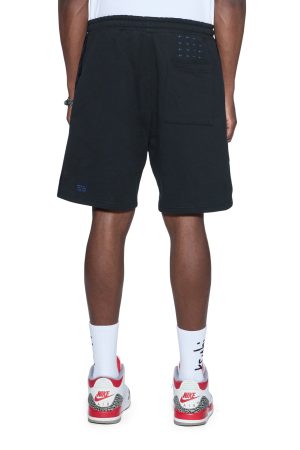 The 4X4 Luxe Synthesis Trak Short Black is a relaxed fit short finishing at knee length. with in-seam pockets and back patch pockets. Cut from heavyweight loopback cotton fleece in jet black. it features flocked side seam panels with cobalt blue saddle stitching. a Sign of the Times applique logo. and is finished with signature T-box and 4×4 embroidery branding.