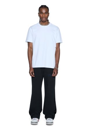 The 4X4 Paise Biggie SS Tee White/Black is an oversized short sleeve t-shirt with a raw-cut back hem. reverse overlocked side seam. and signature rats tail. Crafted from premium cotton jersey in black. it features front embroidery and is finished with signature T-box and flocked-applique 4×4 branding with contrast edge saddle stitching.
