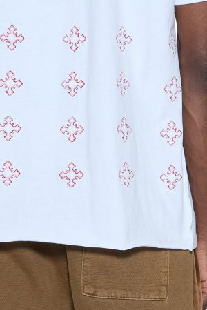 The 4X4 Paise Biggie SS Tee White/Red is an oversized short sleeve t-shirt with a raw-cut back hem. reverse overlocked side seam. and signature rats tail. Crafted from premium cotton jersey in white. it features front embroidery and is finished with signature T-box and flocked-applique 4×4 branding with contrast edge saddle stitching.
