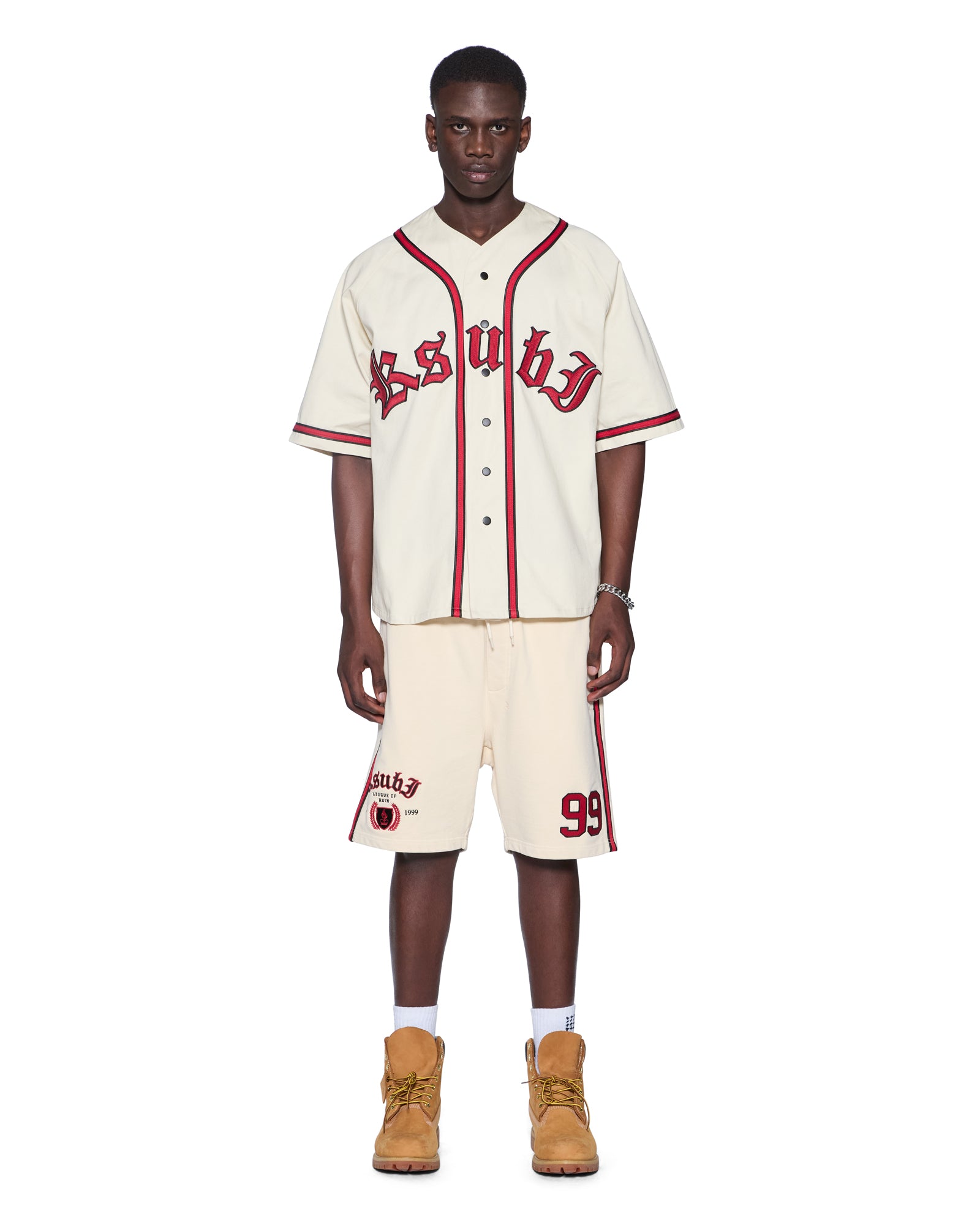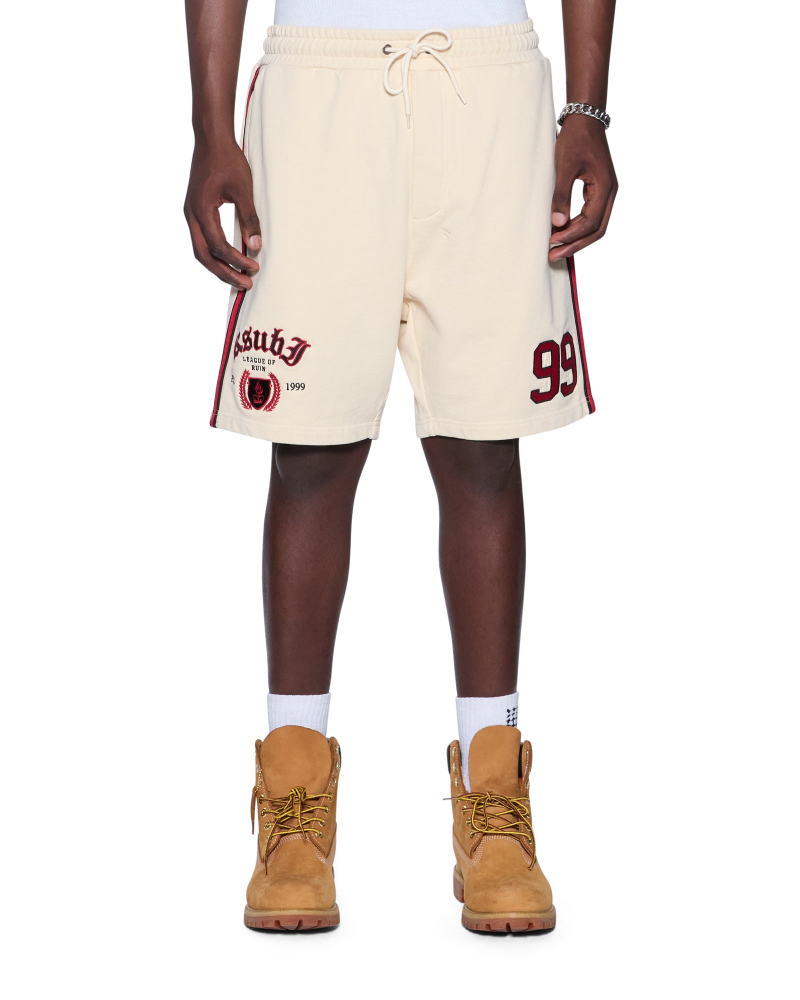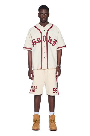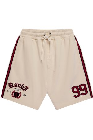 The 99 Kball Short Desert is a relaxed leg short finishing at knee length. with in-seam pockets and back patch pockets. Cut from heavyweight loopback cotton fleece garment dyed in a desert colourway. it features side seam contrast paneling and seasonal artwork embroidered on the legs. Finished with signature t-box and 4×4 embroidery branding.