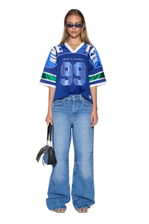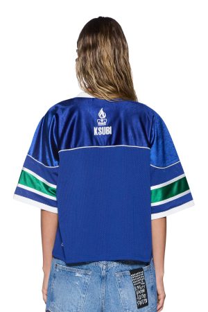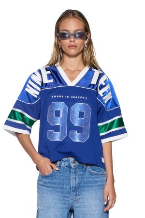 The 99 Spark Ss Jersey Blue is an oversized v-neck jersey with dropped shoulders. short sleeves and a cropped silhouette. Designed with panel detailing. ribbed collar and sleeve hems. it is crafted from premium satin finish sports jersey spliced with perforated basketball mesh in seasonal vibrant blue and green. elevated with contrast white taping. It features a 99 sequin patch appliqué at the front and textural graphic prints on the front and back. finished with signature t-box embroidery. Style back with the Barrel Jean Spirit Spar.