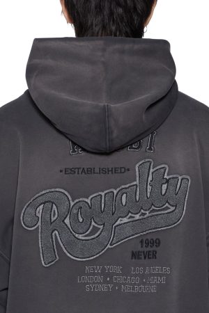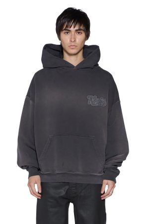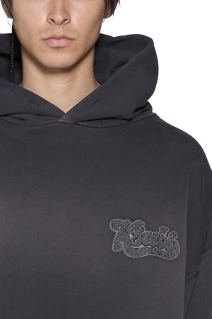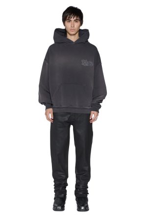 The Ace Ekcess Hoodie Grey Fade is a boxy oversized fit hoodie featuring a single piece hood. zip through front closure. front pouch pocket and signature rats tail detail. Made from premium loopback fleece in a vintage charcoal wash. it showcases garment spray detailing and boucle Ksubi branded patches on the chest and back. Finished with T-box and 4×4 embroidery branding.