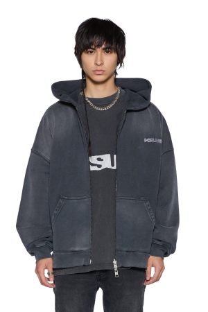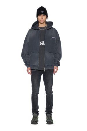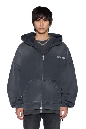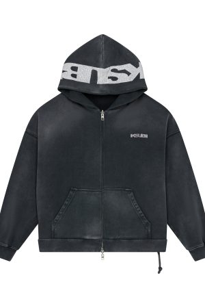 The Ace Ekcess Zip Thru Hoodie Black Fade is a boxy. oversized-fit hoodie with a single-piece hood. zip-through front closure. front pouch pocket. and rats tail detail. Made from premium 480gsm loopback fleece in vintage black. it features a garment spray for highs and lows and a large crack print across the hood and front chest. finished with T-box and 4×4 embroidery branding.