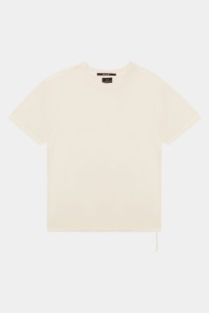 The All Day Biggie Ss Tee Desert is an oversized fit t-shirt made from an age washed tan cotton jersey. This tee features tonal text on the front left chest and a t-box on the side. Finished off with a signature rats tail. raw-cut back hem and a reverse overlocked side seam.