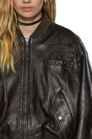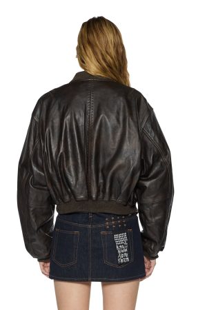 The Alpha Crop Bomber Worn Black is a regular fit. waist-length leather jacket crafted from 100% premium calf leather with a distressed pigment finish for a vintage chocolate-toned effect.