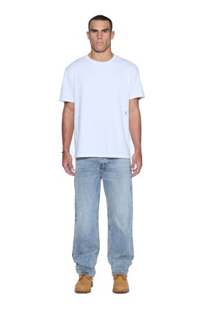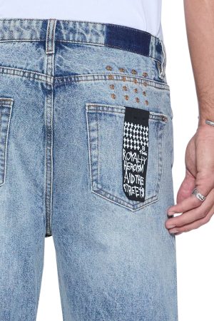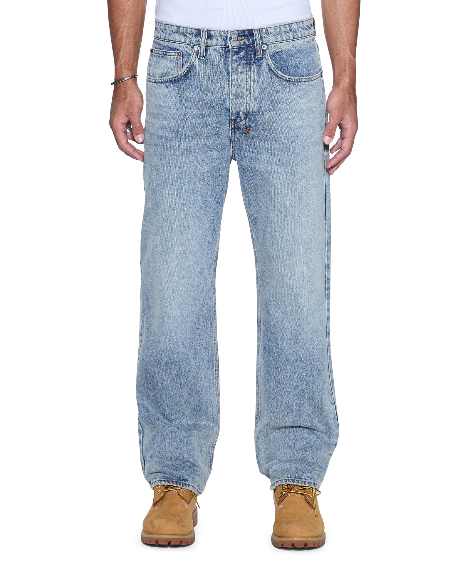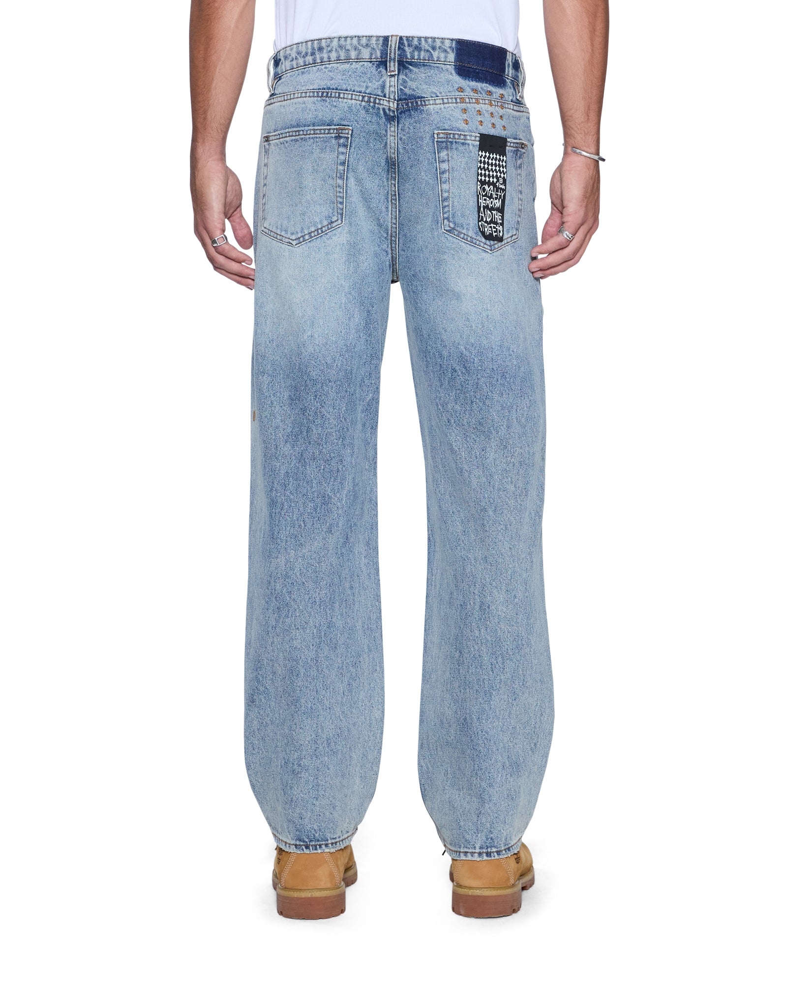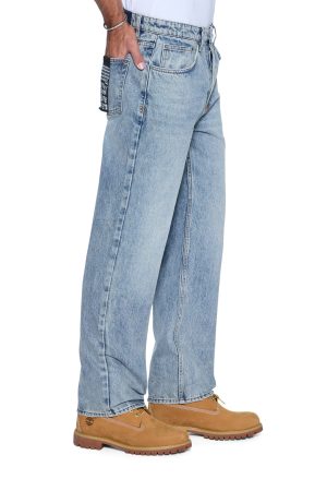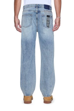 The Anti K Champagne Blue is a mid rise. relaxed straight jean with a regular leg opening and heavy stacking at the ankles. This style is made from a premium rigid denim featured in a light wash. The jean is detailed with light seam grinding. a ghost patch on the back and classic Ksubi branding.