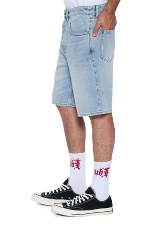 The Anti K Short Siberia is a mid-rise relaxed short with a straight-fitting leg that finishes above the knee. Made from premium rigid denim with a heavy stone wash. it is finished with T-box and 4×4 embroidery. ghost patching detailing. and Ksubi branded hardware.
