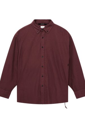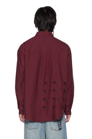 The Anti LS Shirt Ox is a relaxed. short boxy fit button-down shirt with long sleeves. a button-down collar. and a scooped hem. Cut from midweight premium cotton oxford shirting in a burgundy ox colour. it features a cross-dollar detail at the front. large 4×4 embroidery on the back. and Ksubi branded hardware.