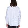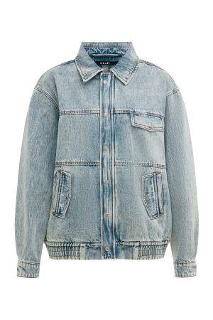 The Aria Bomber Youth is an oversized bomber jacket. with a two-way open ended zip. The design features dropped shoulders and branded snaps down the centre. Distressed details are featured on the collars. hems and pockets. The oversized jacket is made from a premium rigid denim in mid-blue and has a vintage tinted stone wash with branded anti silver hardware. This style features the Ksubi T-box and 3×4 back cross embroidery. Wear this jacket back with matching the matching Detached Jean Youth.