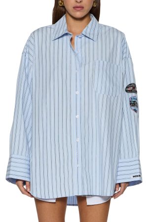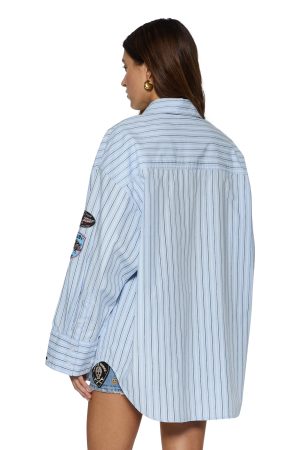 The Astra Ls Shirt Blu Stripe Badg is an oversized button-up made from premium 100% cotton in a multi-blue stripe. It features a patch pocket. curved hem. center front collar. exaggerated cuffs. seasonal varsity-style patches on the right sleeve. a SOTT woven label on the cuff. and Ksubi T-box embroidery.