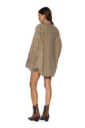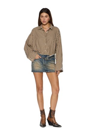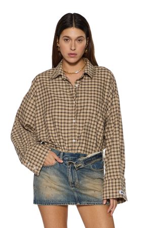 The Astra Ls Shirt Tan Plaid is an oversized button-up shirt made from premium European 100% organic cotton in a tan plaid colourway. Featuring a patch pocket. curved hem. classic center front collar and exaggerated cuffs. it’s finished with a ‘SOTT’ woven label on the cuff and Ksubi T-box embroidery. Style back with any Ksubi denim for an off-duty elevated look.
