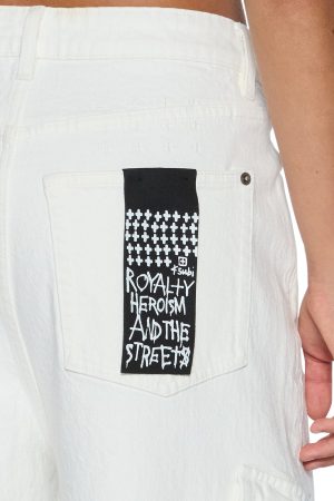 The Baggy Jean Cargo Ecru is a relaxed wide leg jean with a mid-rise. crafted from premium Ecru denim with tonal topstitching. Designed with a longer length to stack stylishly above the ankle. it features angled cargo pockets. classic five-pocket styling. Ksubi branded hardware. T-box and 3×4 embroidery. and a removable pocket tag attached to the wearer’s right back pocket.