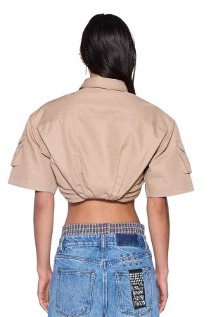 The Barker Crop Short Sleeve Shirt Tan is a cropped short-sleeve shirt crafted from premium cotton twill in a tan colourway and fully lined for a structured finish. Designed with a fashion-forward gathered tuck detail at the back for a modern. going-out take on a classic shirt silhouette. the style features a pointed collar. snap-button closure with anti-silver hardware. cargo-style sleeve pockets. and A-line sleeves for a bold statement shape. The shirt is finished with an anti-silver Ksubi metal press plate and T-box embroidery.