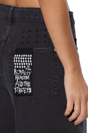 The Barrel Jean Carpenter Black is a a mid-rise. relaxed fit with a distinctive barrel-shaped leg that tapers at the ankle. Made from premium black overdyed nailhead canvas with a soft stone wash and subtle signs of wear. it includes front carpenter patches with rivets. classic five-pocket styling. anti-silver Ksubi branded hardware. T-box and 3×4 embroidery. and a removable pocket tag attached to the wearer’s right back pocket. Designed to offer a flattering and sculptural silhouette to any wardrobe.