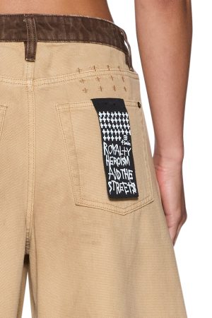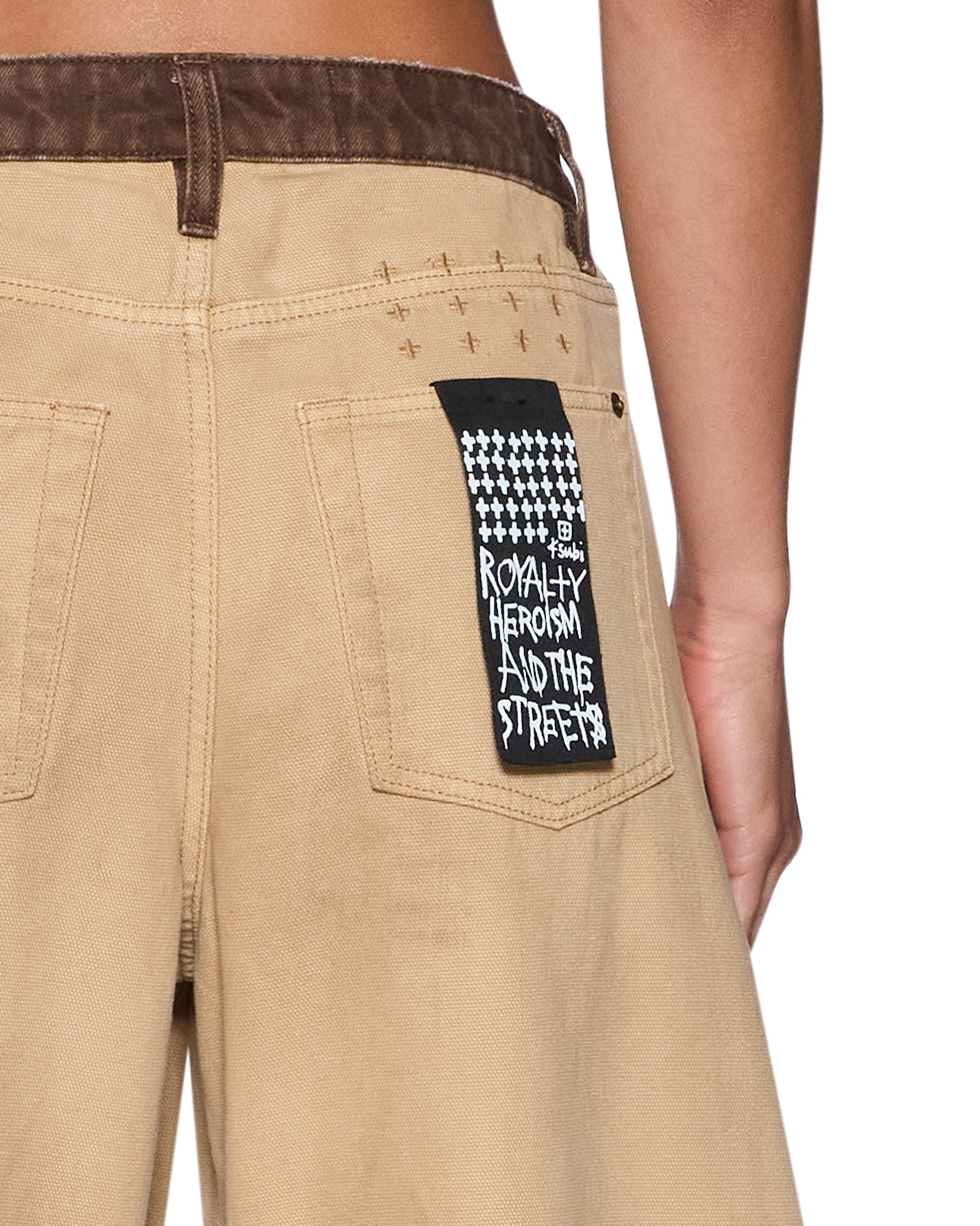 The Barrel Jean Carpenter Jean Sierra Tan is a mid-rise. relaxed fit jean with a distinctive barrel-shaped leg that tapers at the ankle. Made from heavyweight 100% cotton nailhead canvas in an overdyed tan colourway. spliced with chocolate brown denim at the waistband. it features partial grinding at the waistband. pockets and hem along with subtle oil stain splashes. Finished with classic five-pocket styling. anti-brass Ksubi branded hardware. and signature t-box and 4×4 embroidery. with a removable pocket tag at the back.
