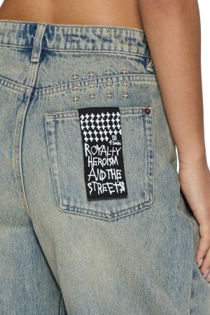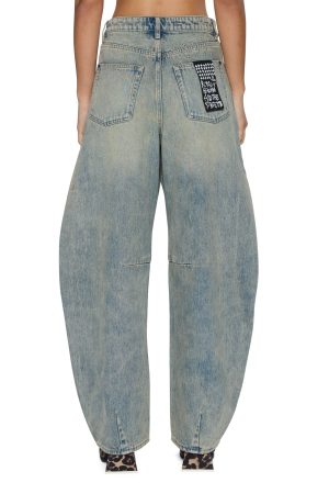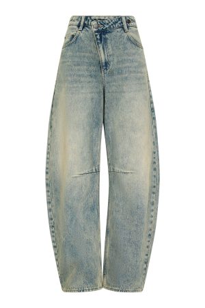 The Barrel Jean Folk is a mid-rise jean with a relaxed fit and distinctive barrel-shaped leg that tapers at the ankle. Made from premium rigid indigo blue denim with a subtle neutral tint and signs of wear. with subtle grinding at the waistband. pockets. and hem. It features an asymmetric waistband. classic five-pocket styling. with Ksubi branded hardware. T-box and 3×4 embroidery. and a removable pocket tag attached to the wearer’s right back pocket. Designed to be a flattering and sculptural silhouette. Style back with Bolt Top Folk Blessings for an effortlessly chic look.