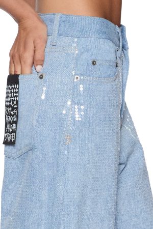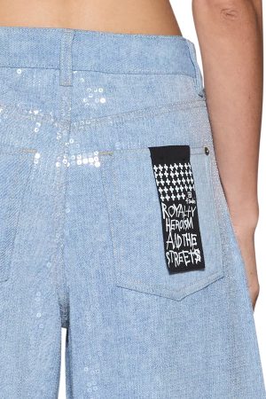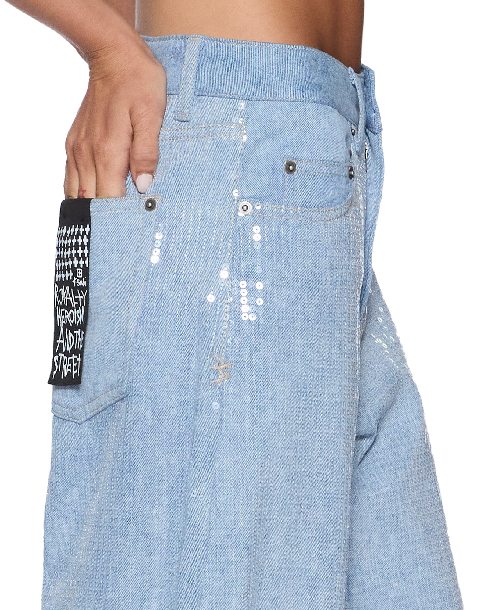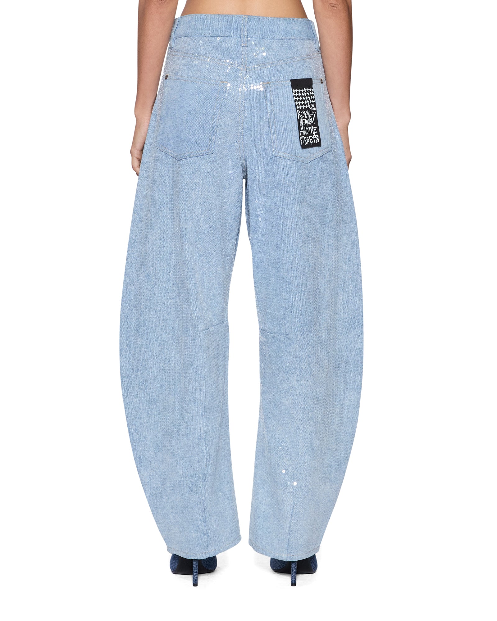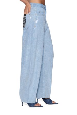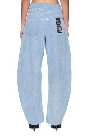 The Barrel Jean Sequin Spirit Spark is a mid rise. relaxed fit jean with a distinctive barrel shaped leg that tapers at the ankle. Made from lightweight denim in a light blue wash. it is finished with all over clear sequin embellishment for an elevated party look. Finished with classic five pocket styling. anti silver Ksubi branded hardware. t-box and 3×4 embroidery and a removable pocket tag at the back.
