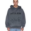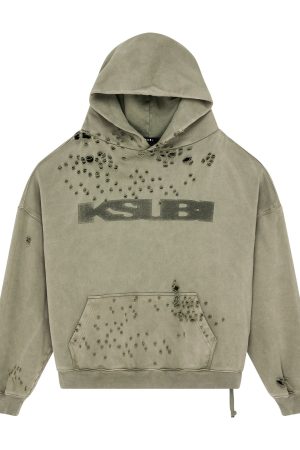 The Blasted Ekcess Hoodie Outback is a boxy oversized fit hoodie with a single-piece hood. front pouch pocket. and rats tail detail. Made from European loopback fleece in the Outback colourway. it features the Sign of the Times logo print paired with seasonal scatter deconstruction on the front and back. finished with tonal T-box and 4×4 embroidery branding.