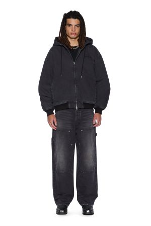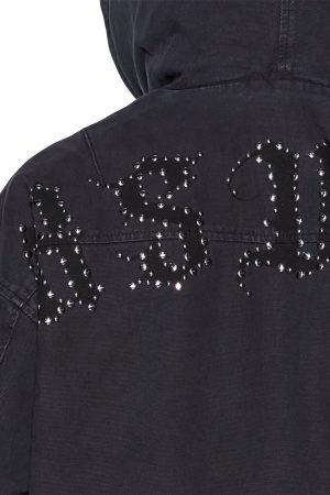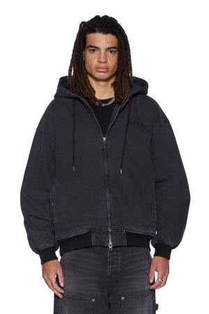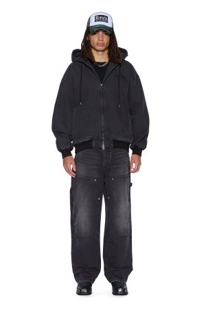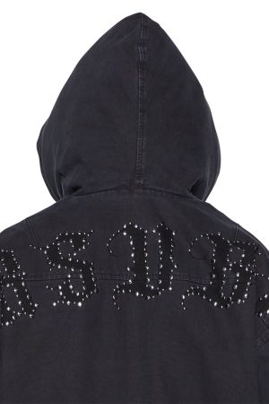 The Bomber Jacket Stud Black features an oversized slouchy fit with a hood and is crafted from durable nailhead canvas with a heavy stone wash. It includes welt closure hidden snap pockets. an internal lining pocket. rib-knit cuffs and hem. and a centre front zip closure. Design details feature a ghost patch Ksubi logo on the back outlined with silver metal hot fix studs. Finished with tonal signature t-box and 4×4 embroidery branding.