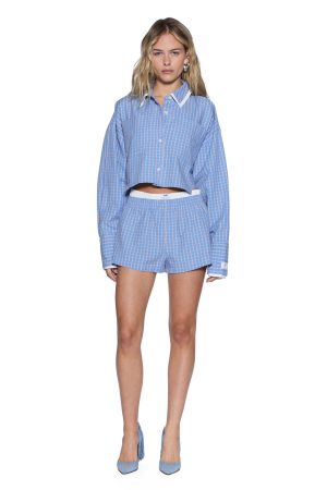 The Boxer Shorts Blu Check are mid-rise pull-on shorts with a mini length. featuring an elasticated waistband with a contrast double-layer design and a Ksubi ‘Made in Heaven’ woven label at the front. Crafted from premium 100% cotton in a custom handloom plaid with a seasonal blue check. they are finished with a back patch pocket. T-box and 3×4 embroidery. perfect to wear with the matching Balter Shirt or layered under denim for a relaxed. styled look.