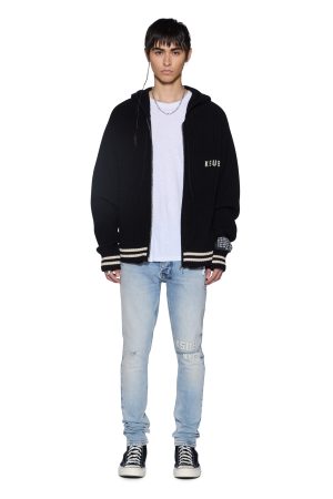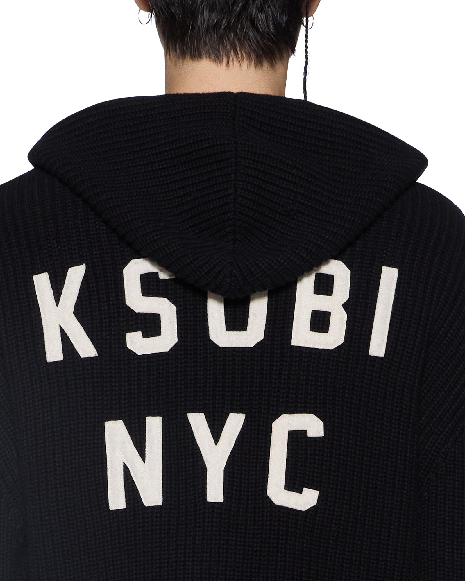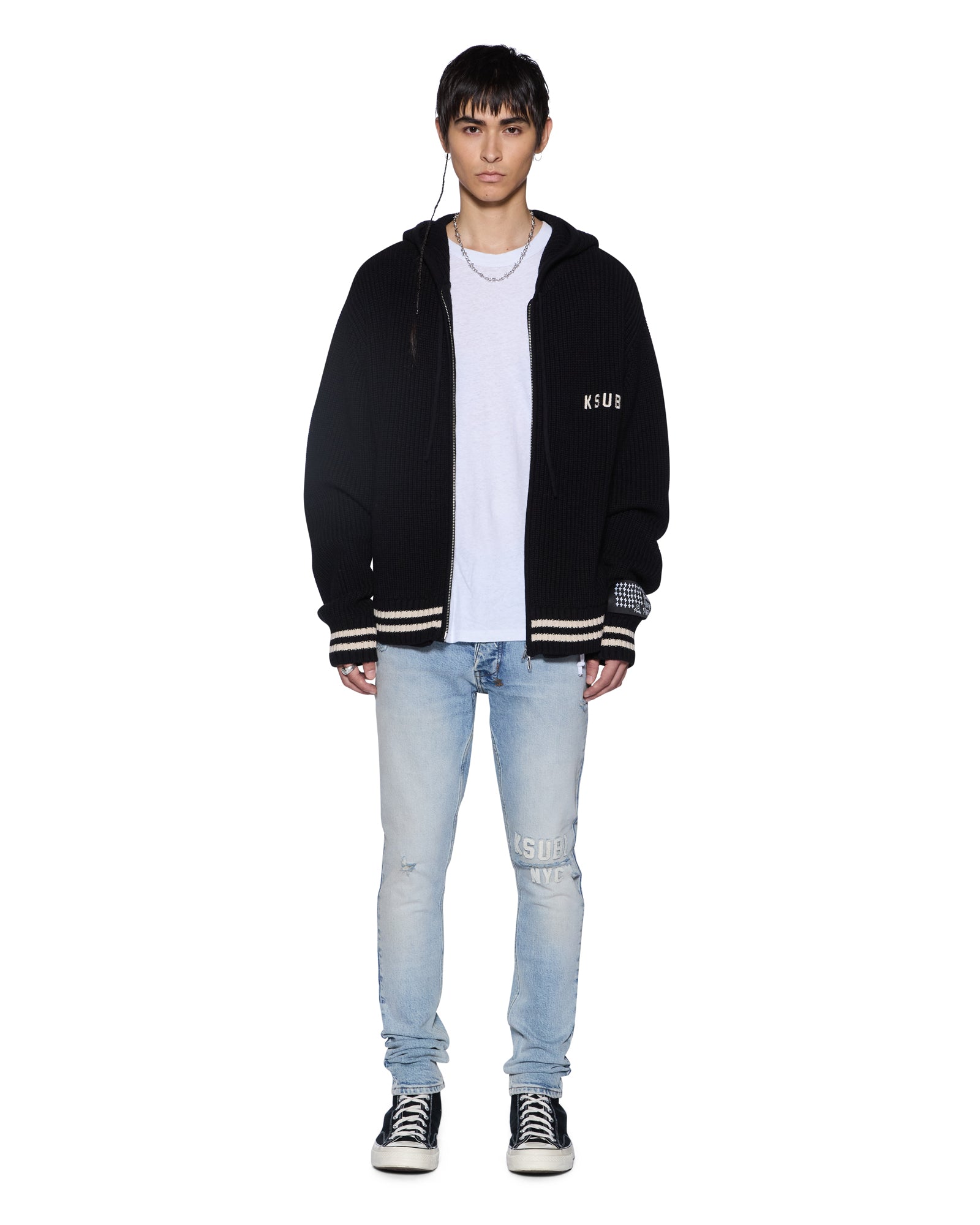 The Boxer Zip Knit Hoodie Midnight is a relaxed boxy fit hoodie with a zip-through front. drawstring hood and pouch pocket. Knitted from 100% cotton navy yarn in a heavy gauge. it features tipping stripe sleeves and seasonal felt appliqued Ksubi artwork on the front and back. Finished with signature t-box and 4×4 branding.
