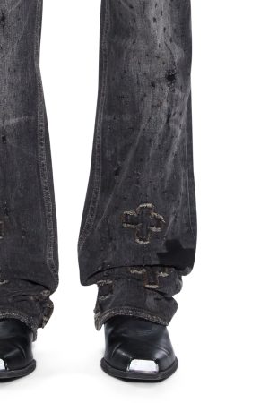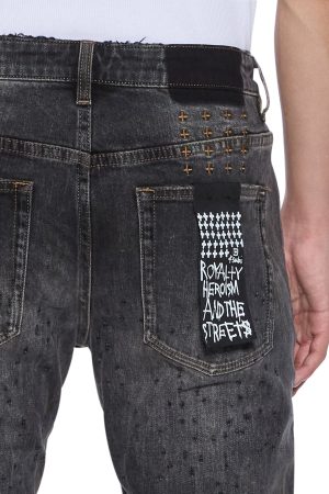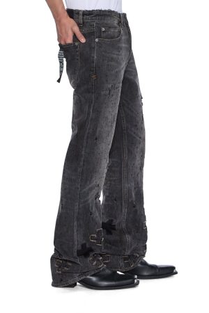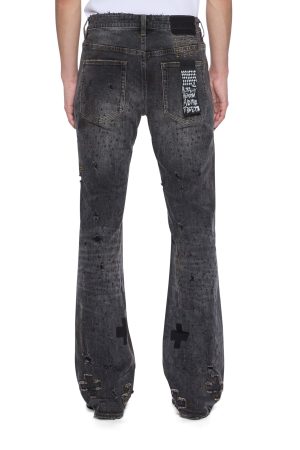 The Bronko Asher Black Shotgun is a mid-rise. full-length jean with a boot-cut leg. Made from premium black stretch denim with heavy stonewash and ageing treatments. it features light scattered abrasions. appliqued pluses with ghosted plus patches near the boot hem. and is finished with signature T-box and 4×4 embroidery and Ksubi branded hardware.