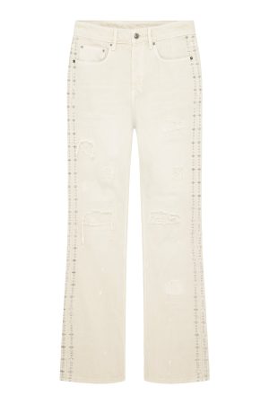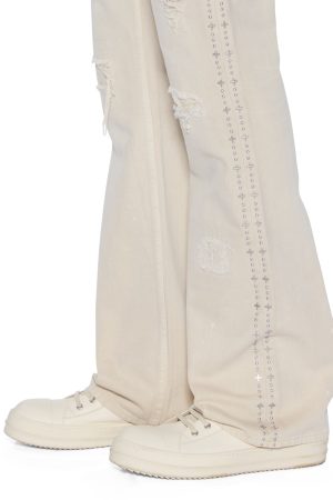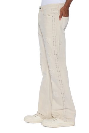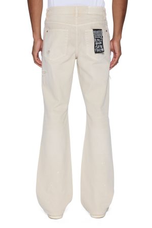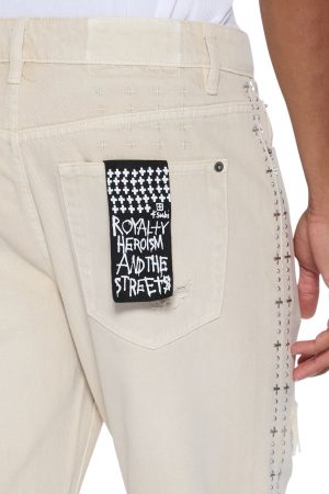 The Bronko Ivory Trashed is a mid-rise full-length jean with a boot-cut leg. crafted from premium denim with an overdye and stone wash. Featuring rip and repair deconstruction. denim re-patching. and metal studded hotfix details along the side seam. it’s completed with an unfinished hem. signature T-box and 4×4 embroidery. and Ksubi branded hardware.