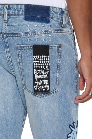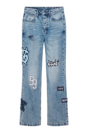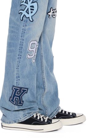 The Bronko Striker Patched is a mid-rise. full-length jean with a boot-cut leg. crafted from premium rigid indigo denim with a medium stone wash. It features seasonal patches on the front and back. finished with signature Maxx T-box and 4×4 embroidery. along with Ksubi branded hardware for a distinctive finish.