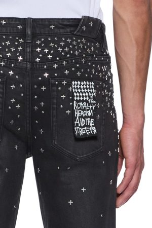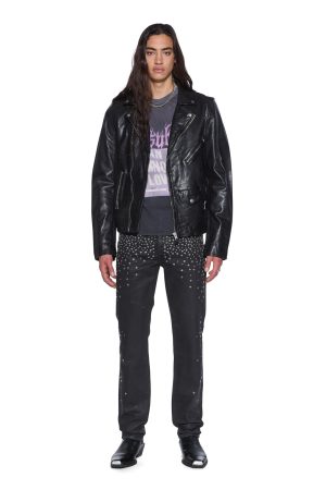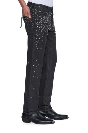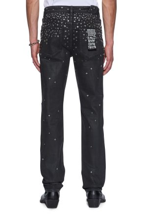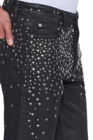 The Chitch Backstage Black Metalik is a slim tapered jean with a mid-long rise and signature Dutch tab. Made from premium comfort stretch black denim with a waxed-look resin coating. it features a compact assortment of metal studs in multiple shapes cascading down the jean. finished with signature T-box and 4×4 embroidery and Ksubi hardware.