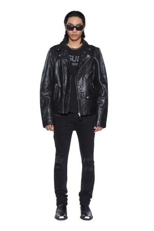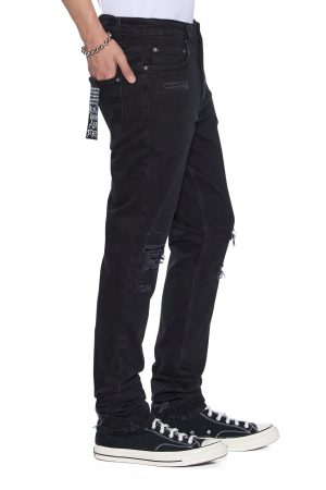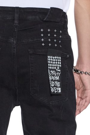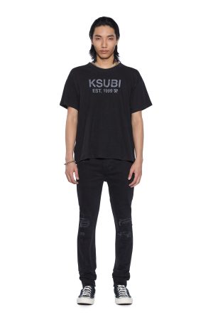 The Chitch Boneyard Black is a mid rise slim fit denim jean featured in a washed black colourway. Constructed from a heavy duty. premium stretch cotton denim sourced from Turkey. these jeans feature signature Ksubi trashing and repair patches. iconic Ksubi branding and removable back pocket tag.