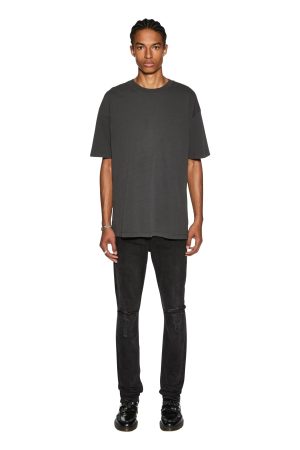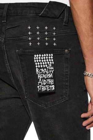 Chitch Krow Krushed is a mid rise slim fit denim jean featured in a dusted black wash colourway. Constructed from a heavy duty. premium stretch cotton denim sourced from Turkey. these jeans feature knee deconstruction and subtle distressing. signature Ksubi branding and removable back pocket tag.