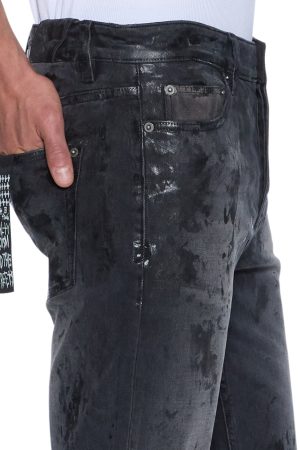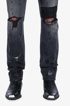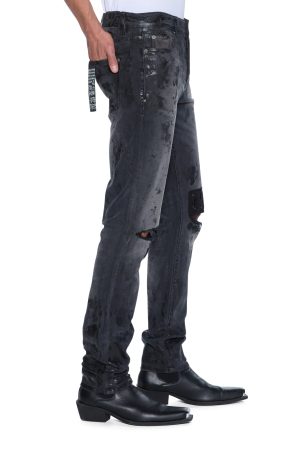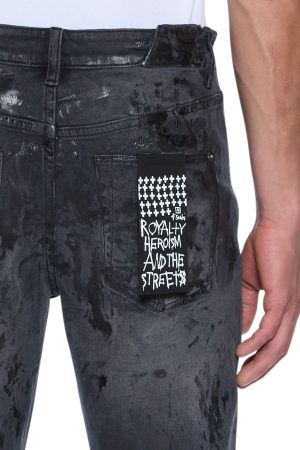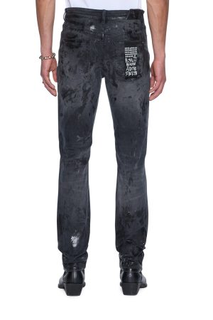 The Chitch Powder Grey Praying is a slim tapered jean with a mid-long rise and signature Dutch tab. Made from premium comfort stretch black denim with a vintage wash. it features tonal foiling or a sporadic wet look. knee deconstructions. and a tonal knee patch with seasonal Ksubi artwork embroidered on top. finished with signature T-box and 4×4 embroidery and Ksubi hardware.