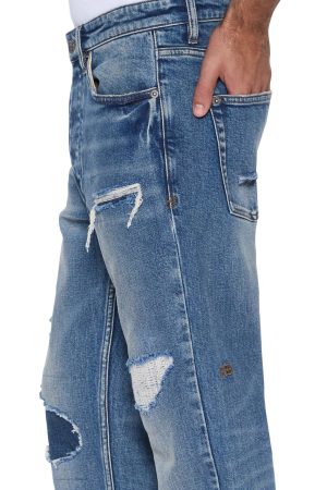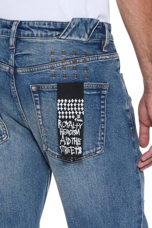 The Chitch Roadhouse 1999 is a slim tapered jean with mid-long rise and signature dutch tab. made from premium comfort stretch indigo denim with a vintage stone wash. Featuring rip and repair deconstruction with denim re-patching and embroidered 1999 logo. finished with T-box. 4×4 embroidery and Ksubi hardware.