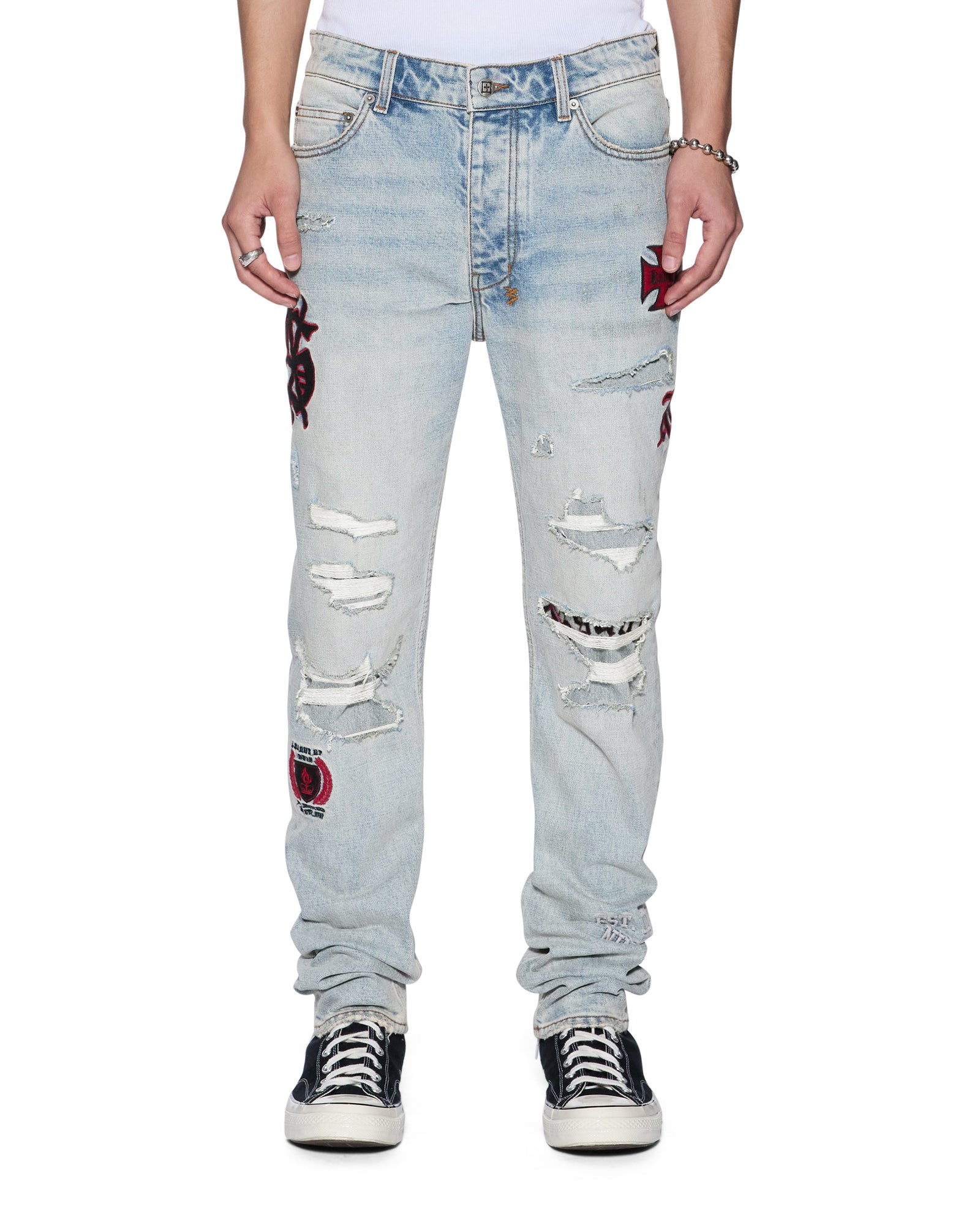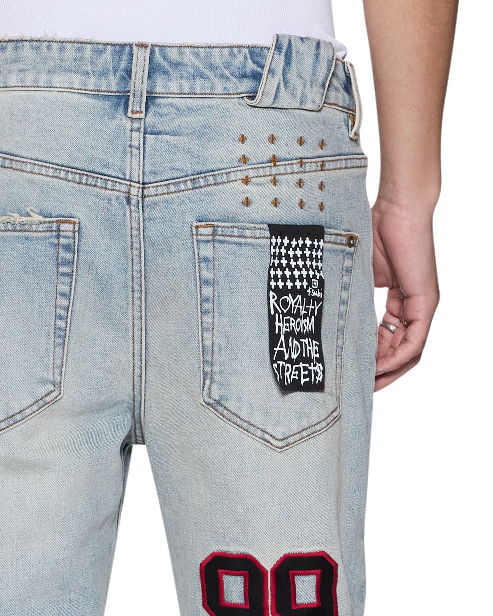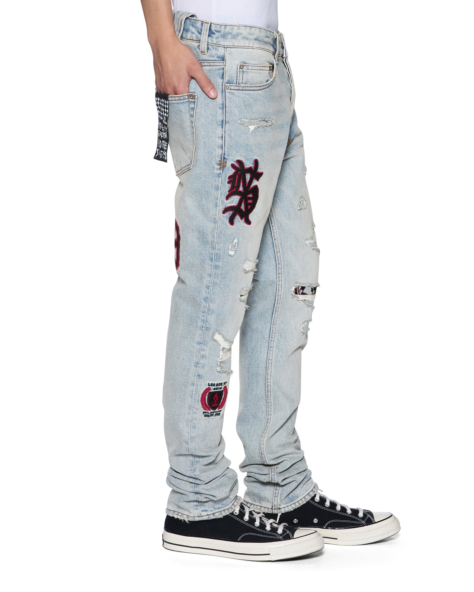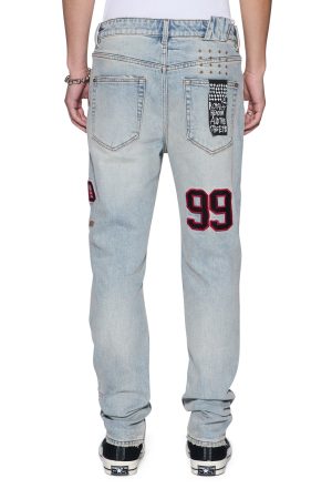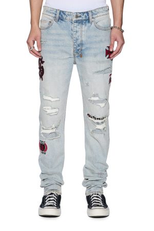 The Chitch Seattle Blue Repair is a slim tapered jean with a mid-long rise and signature dutch tab. Made from indigo comfort stretch denim with a light-tone wash and authentic aging treatments. it is embellished with seasonal and core Ksubi badging sporadically placed down the jean in between rip and repair details. Finished with signature t-box and 4×4 embroidery and Ksubi branded hardware.