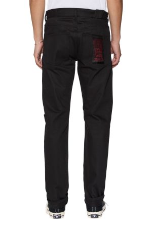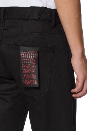 The Chitch Selvedge Raw Black is a slim tapered jean with a mid-long rise and signature Dutch tab. Manufactured in Portugal with a sustainable approach to fabric and laundering processes. it is cut from a 13oz stretch European indigo selvedge denim in a black wash. Featuring paint drops and light abrasions. it is finished with Ksubi signature T-box and 4×4 embroidery. a custom selvedge pocket tag. and Ksubi branded hardware.