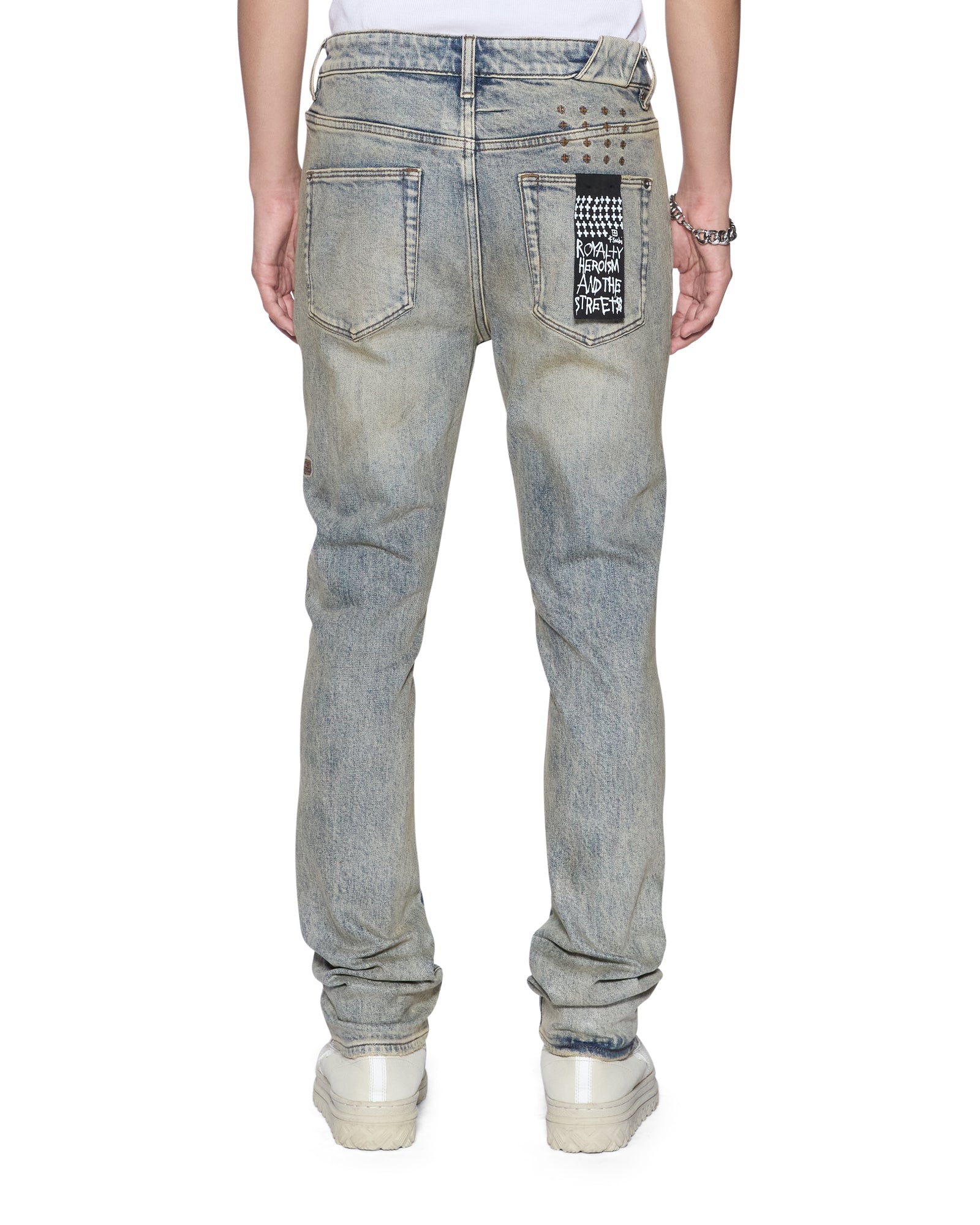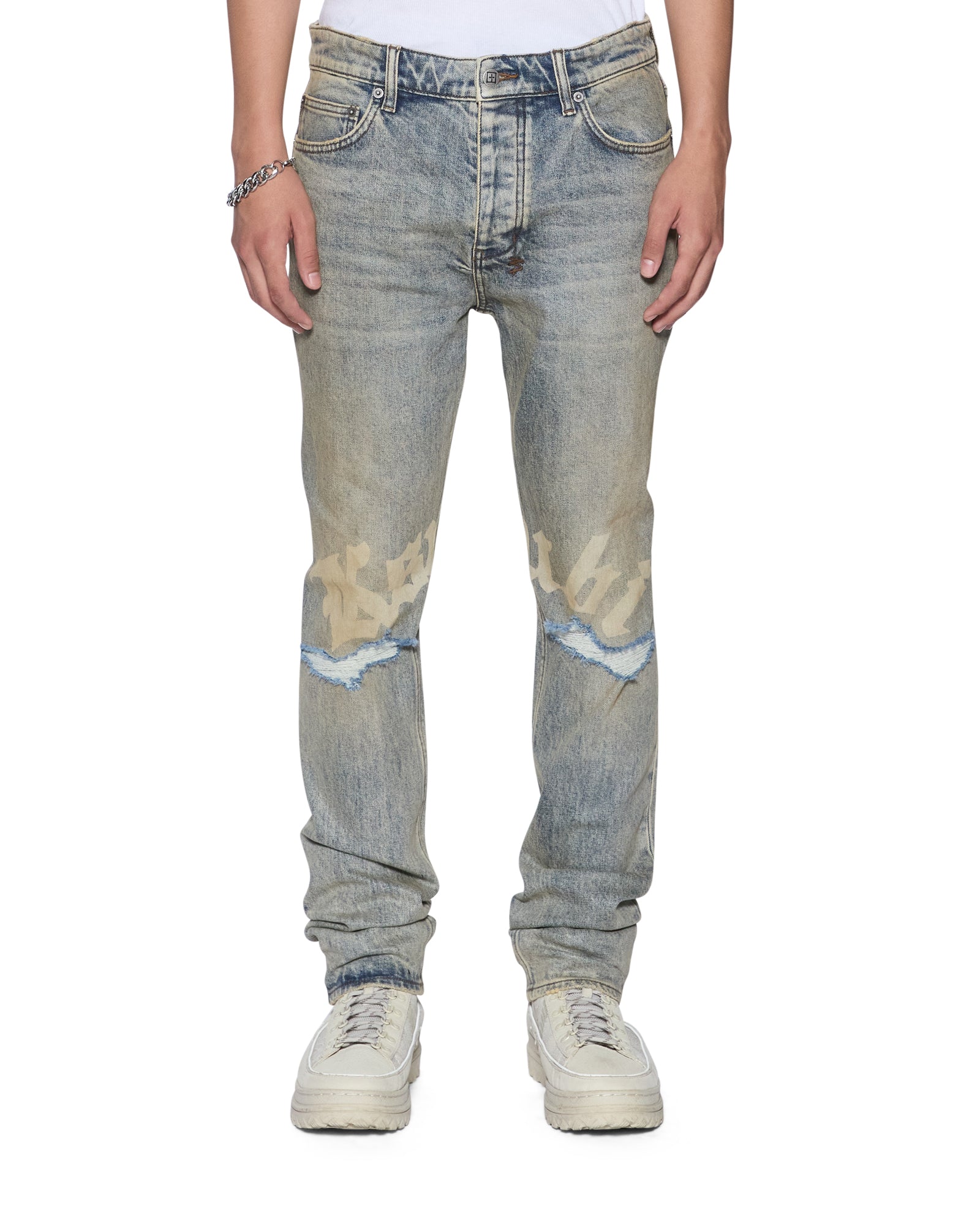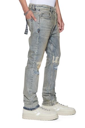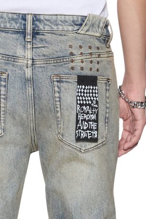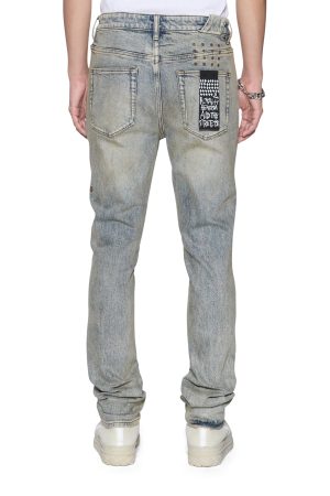 The Chitch Stature Blue Trashed Idols is a slim tapered jean with a mid-long rise and signature dutch tab. Made from indigo comfort stretch denim with a dirty wash and authentic aging treatments. it features a seasonal Ksubi logo running across the legs and knee deconstructions. Finished with signature t-box and 4×4 embroidery and Ksubi branded hardware.