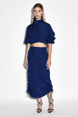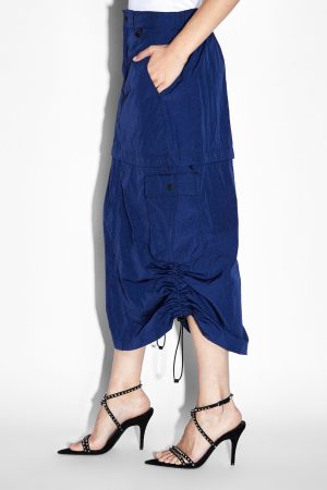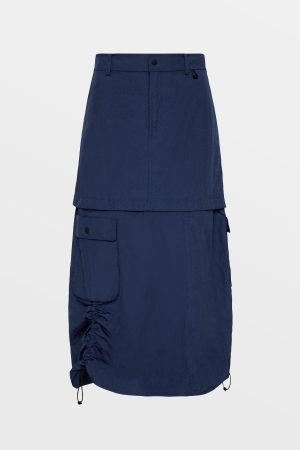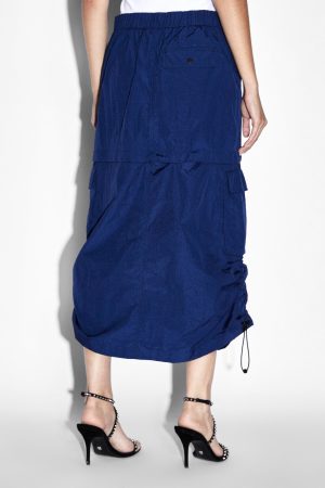 The Connekt Skirt Midnight is a mid rise cargo skirt with a back elasticated waistband and fly front closure. This style features front slash pockets. side seam bellow cargo pockets and back flap pockets. This midi length cargo skirt has a side seam elastic channel with toggles to draw the side seam up to shorten it. Detailed with hidden snaps to convert the skirt into a micro mini. Ksubi’s take on the parachute trend gives wearer’s multiple styling options. Featuring branded hardware. Ksubi t-box and 3×4 back cross embroidery. it is also designed with custom t-box beads on the drawcords. Wear with an ‘Arise Tank’ or style with the ‘Connekt Pullover Midnight Ocean.’