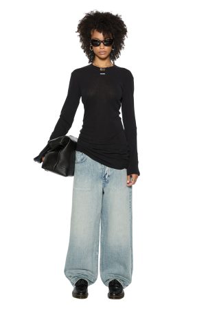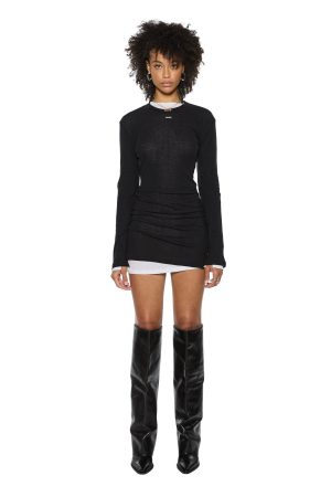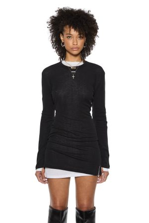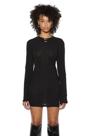 The Crawford Long Sleeve Mini Dress Black is a relaxed fit long sleeve mini dress in a black colorway. crafted from premium European 100% sheer rib cotton. It features splits at the sleeve hem. Ksubi ‘SOTT’ woven label. Cross Dollar embroidery. and T-box embroidery.