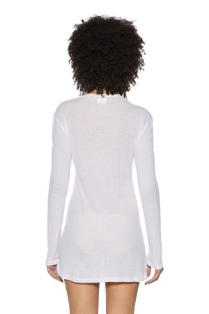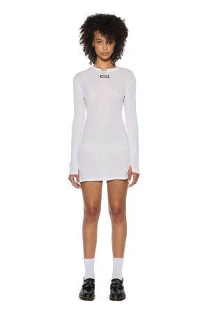 The Crawford Long Sleeve Mini Dress White is a relaxed fit long sleeve mini dress in a white colorway. crafted from premium European 100% sheer rib cotton. It features splits at the sleeve hem. Ksubi ‘SOTT’ woven label. Cross Dollar embroidery. and T-box embroidery.