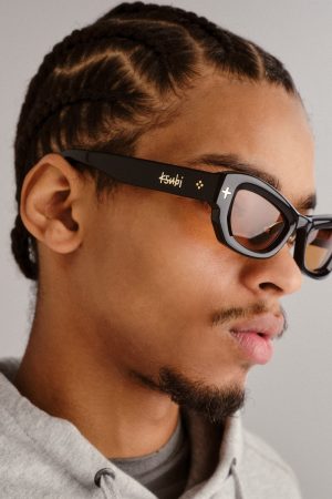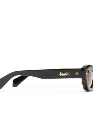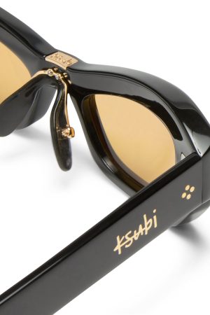 Cypher Sunglasses Black Gold are crafted from glossy black 8mm acetate with an amber-tinted CR39 lens and 18k gold detailing. Featuring custom 7-barrel pin hinges. an adjustable silicon nose pad for universal comfort. and signature cross box tip lamination. each pair arrives with a custom toughbox. foam inner. drawstring pouch. and Ksubi coffin box for ultimate protection.