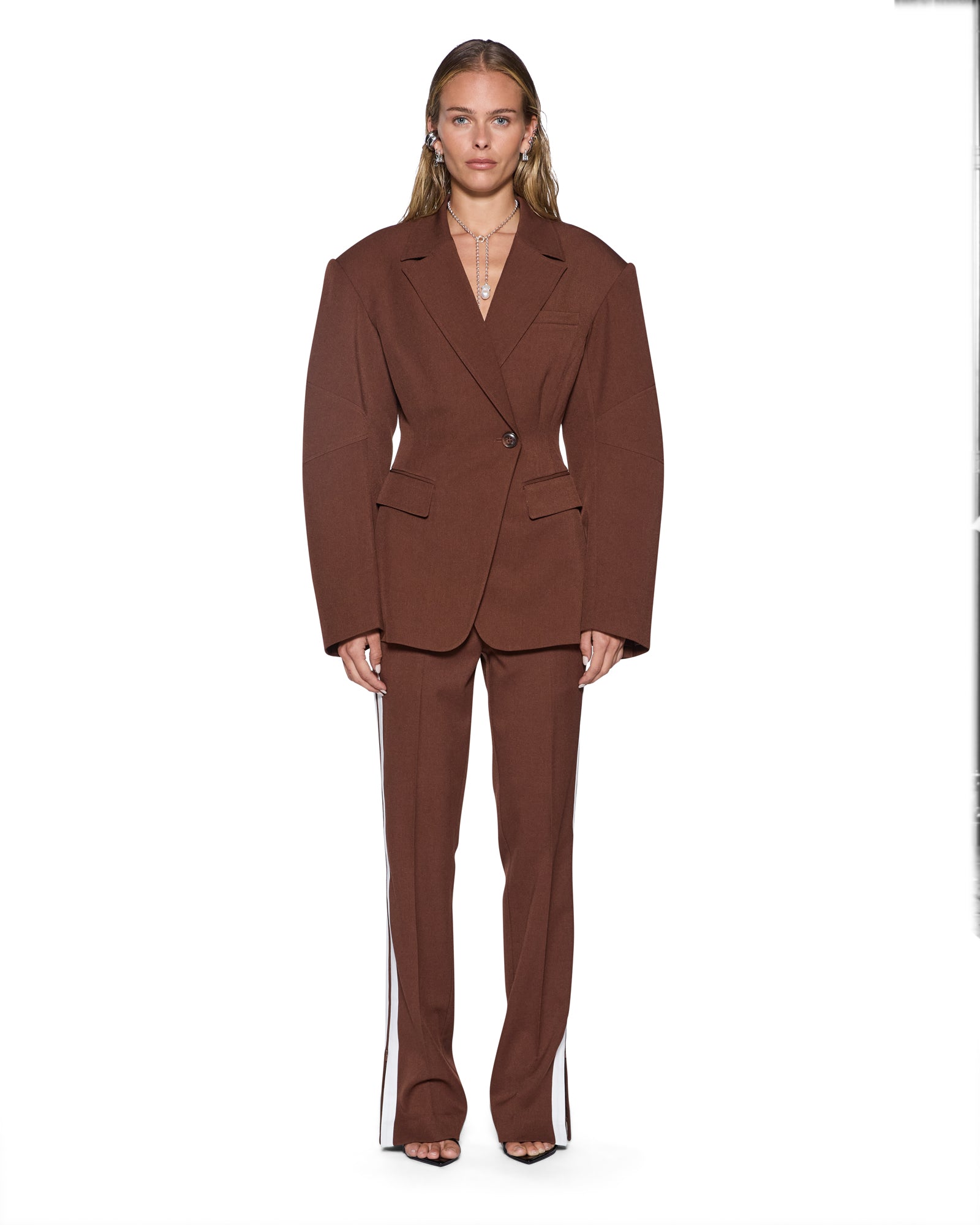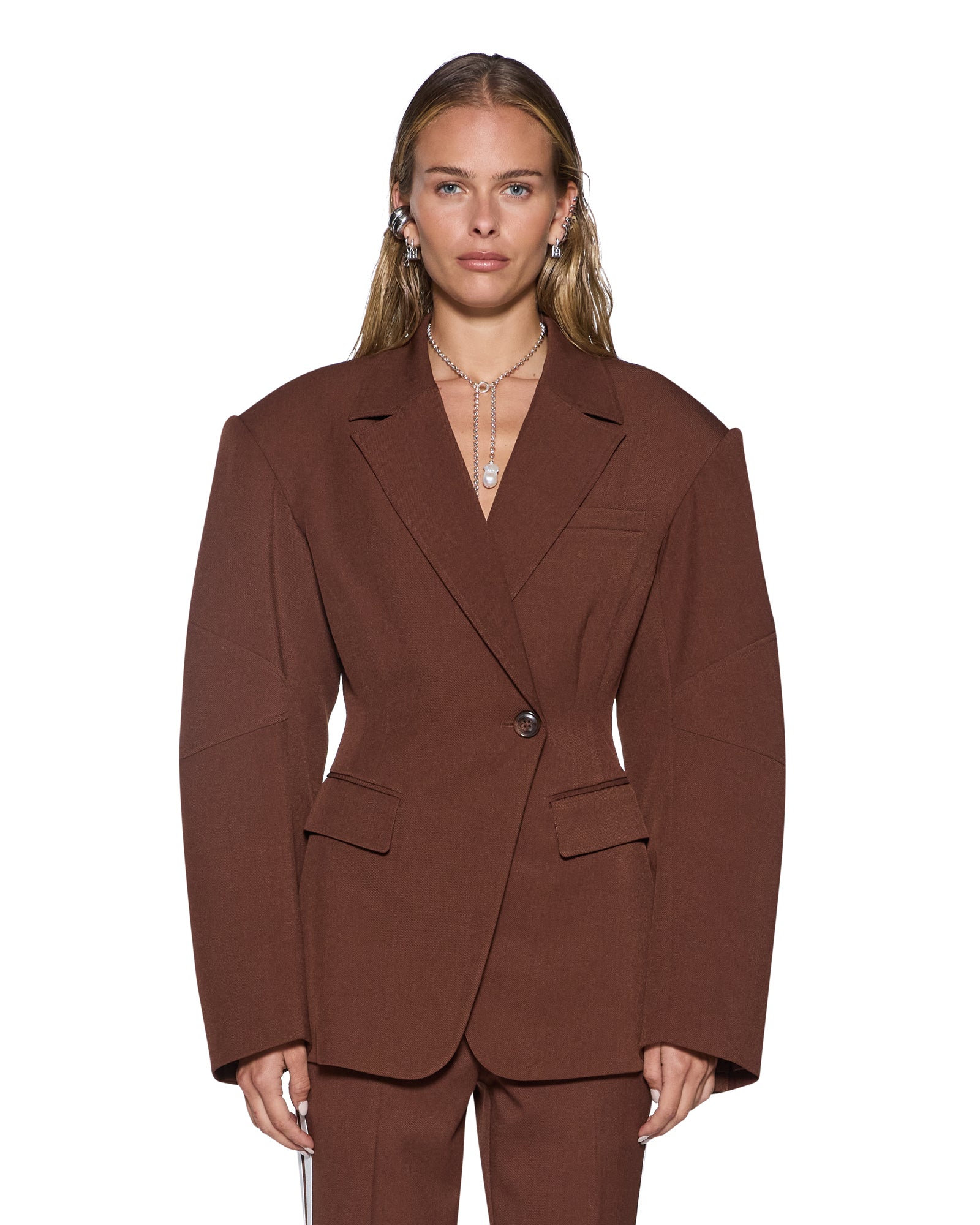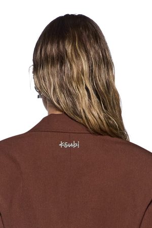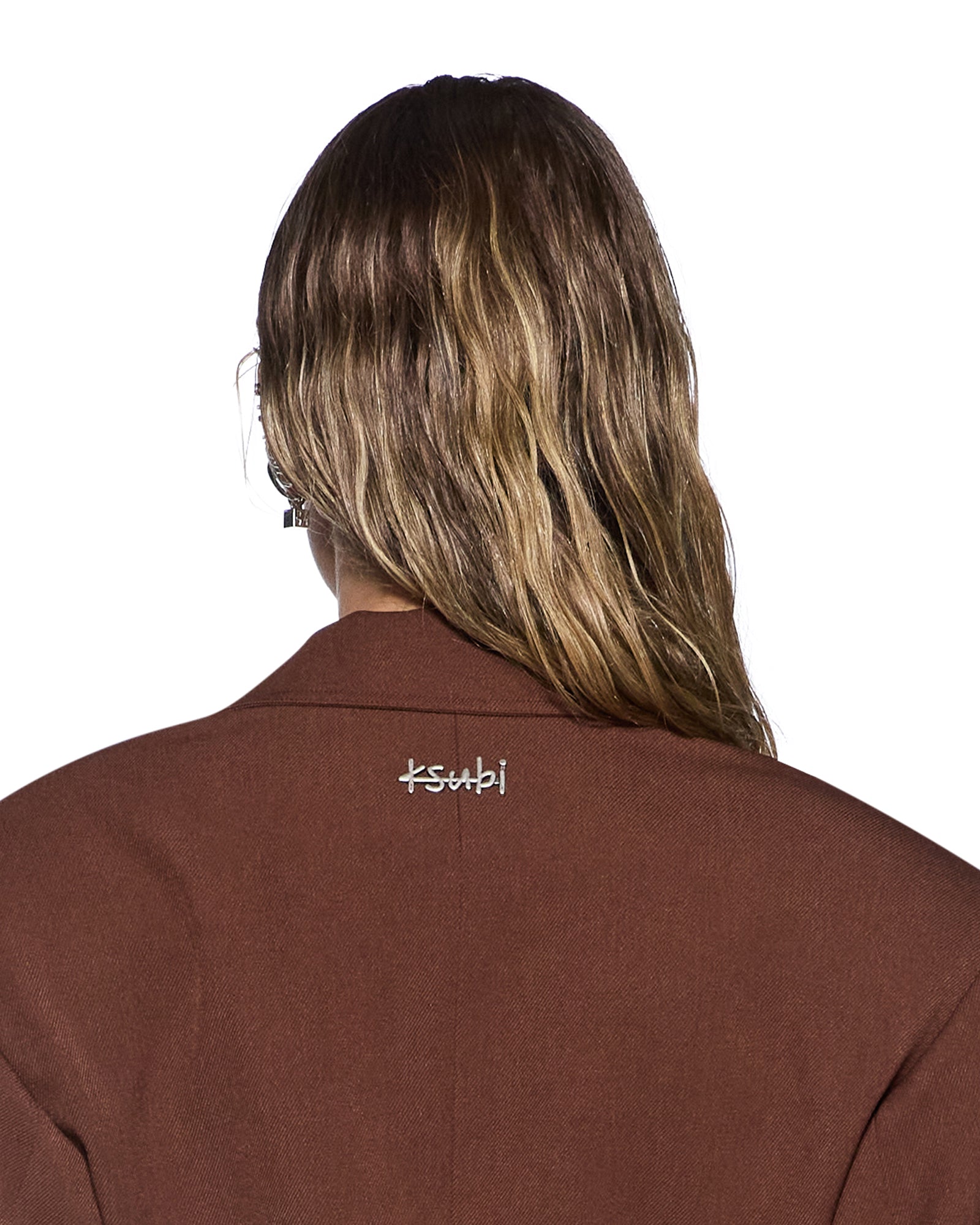 The Dare Cinched Blazer Chocolate is an oversized blazer featuring a cinched waist. cocoon sleeves. and exaggerated drop shoulders for a contemporary tailored silhouette. Crafted from soft structured tailoring fabrication in a rich chocolate colourway and fully lined for a polished finish. the design includes an exaggerated collar. peak lapels. welt pockets. a single-button front closure with an internal jigger button. shoulder pads for structure. a double-breasted appearance. and Ksubi branded buttons with a signature anti-silver Ksubi rivet at the back neck.