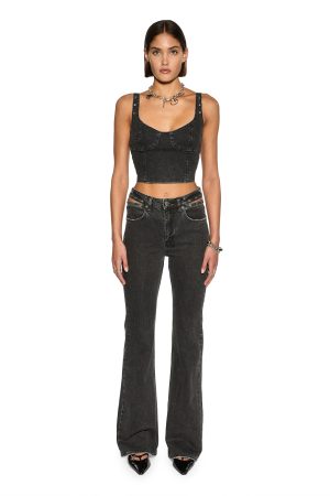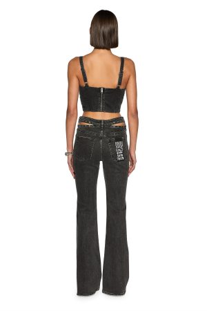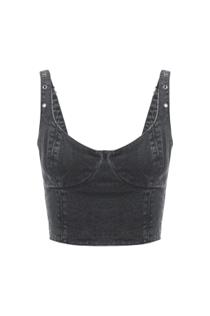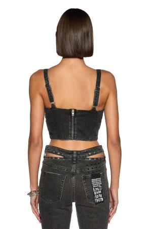 The Dauphine Bustier Shadow is a panelled bustier top with a scoop neck and adjustable staps. Made from premium denim in a heavy washed black. Featuring eyelet details on the straps and along the seams.