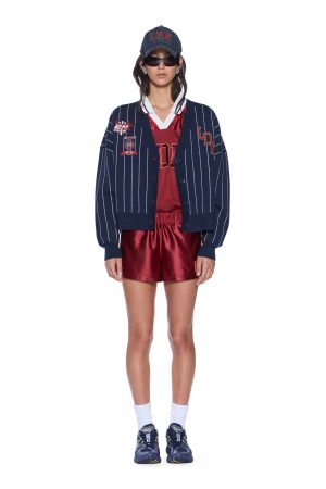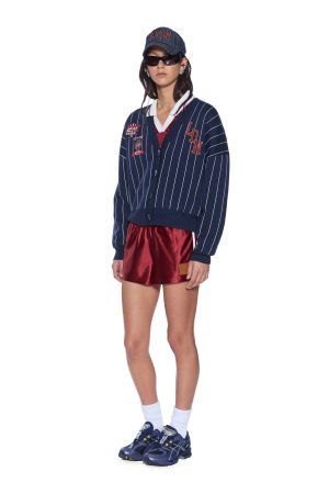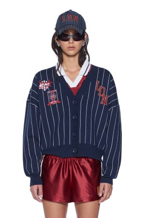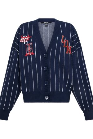 The Dean Cardigan Navy Pinstripe is a boxy. oversized dropped shoulder cardigan with a white knitted pinstripe design. It features oversized branded navy faux horn buttons. custom collaboration patches on the front chest. and a brown PU Ksubi branded patch at the back neck.