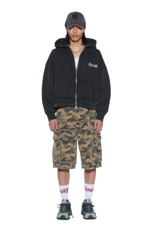 The Death Snake Halen Zip Hoodie Ash is a boxy. waist-length hoodie with a full zip front and twin zippers. Made from garment-dyed black loop-back fleece. it features front pockets. seasonal artwork on the front and back. and is finished with signature T-box and 4×4 detailing.